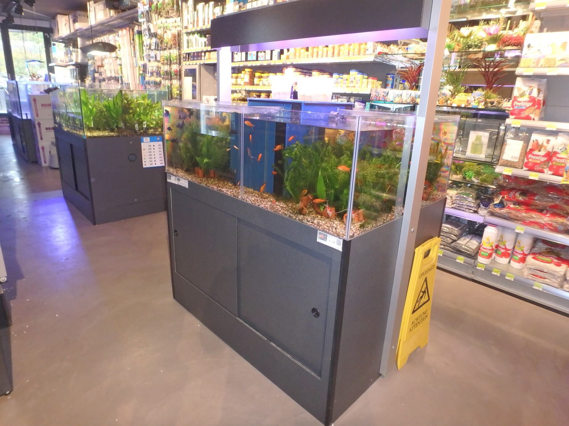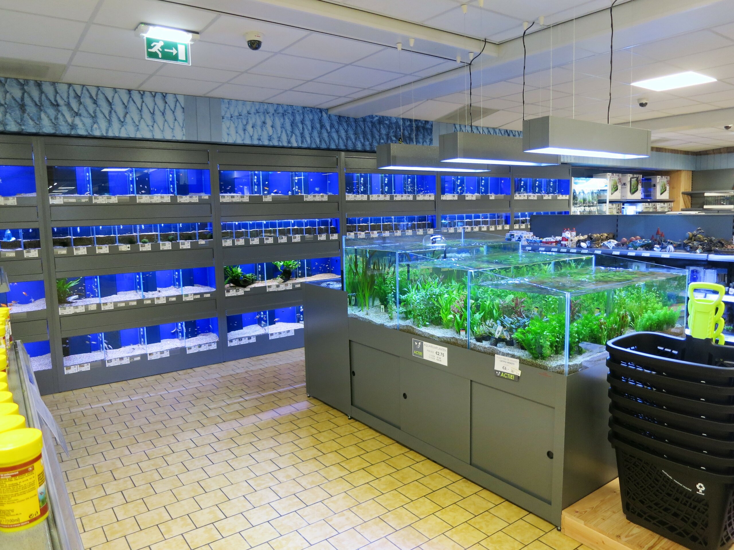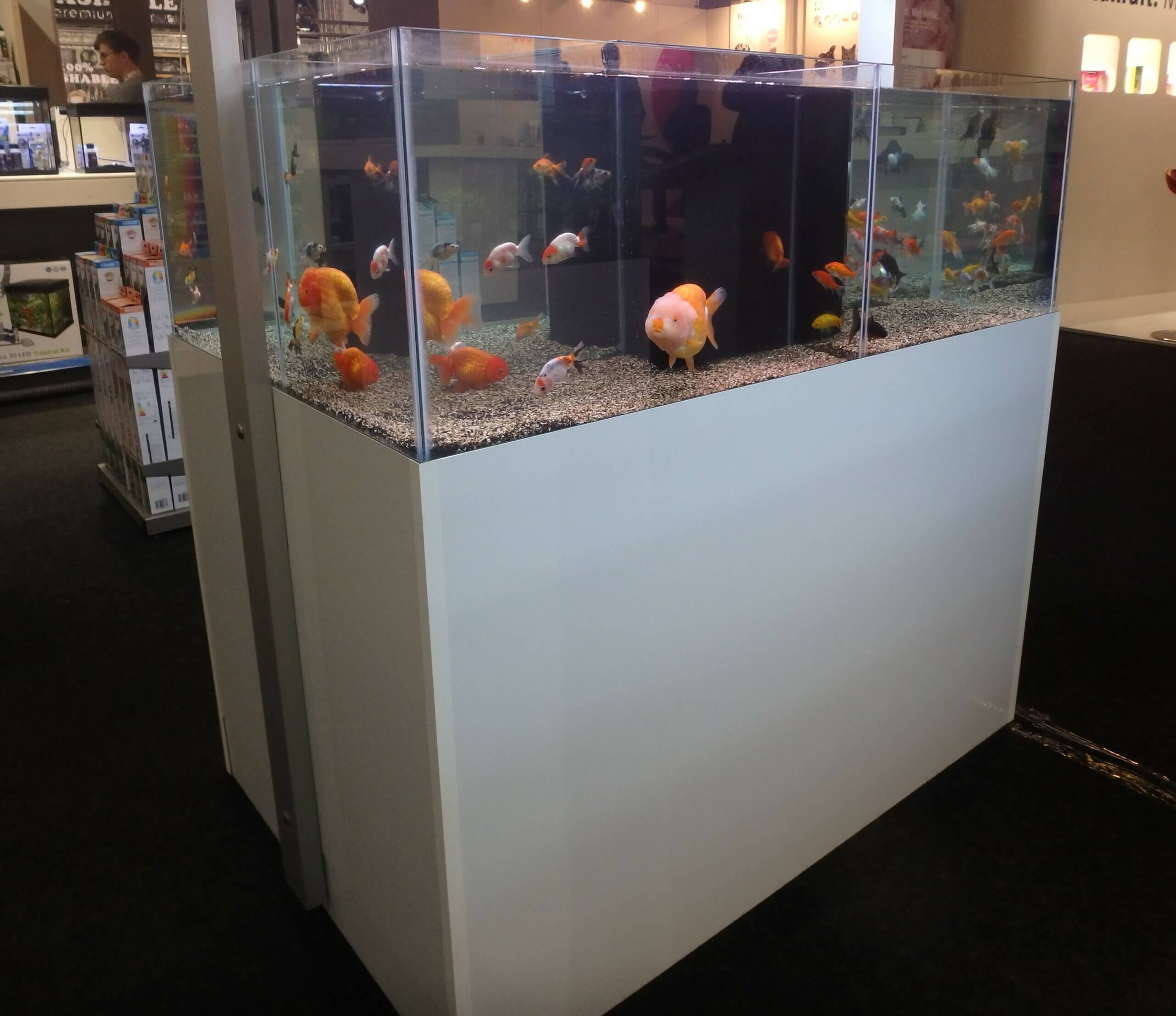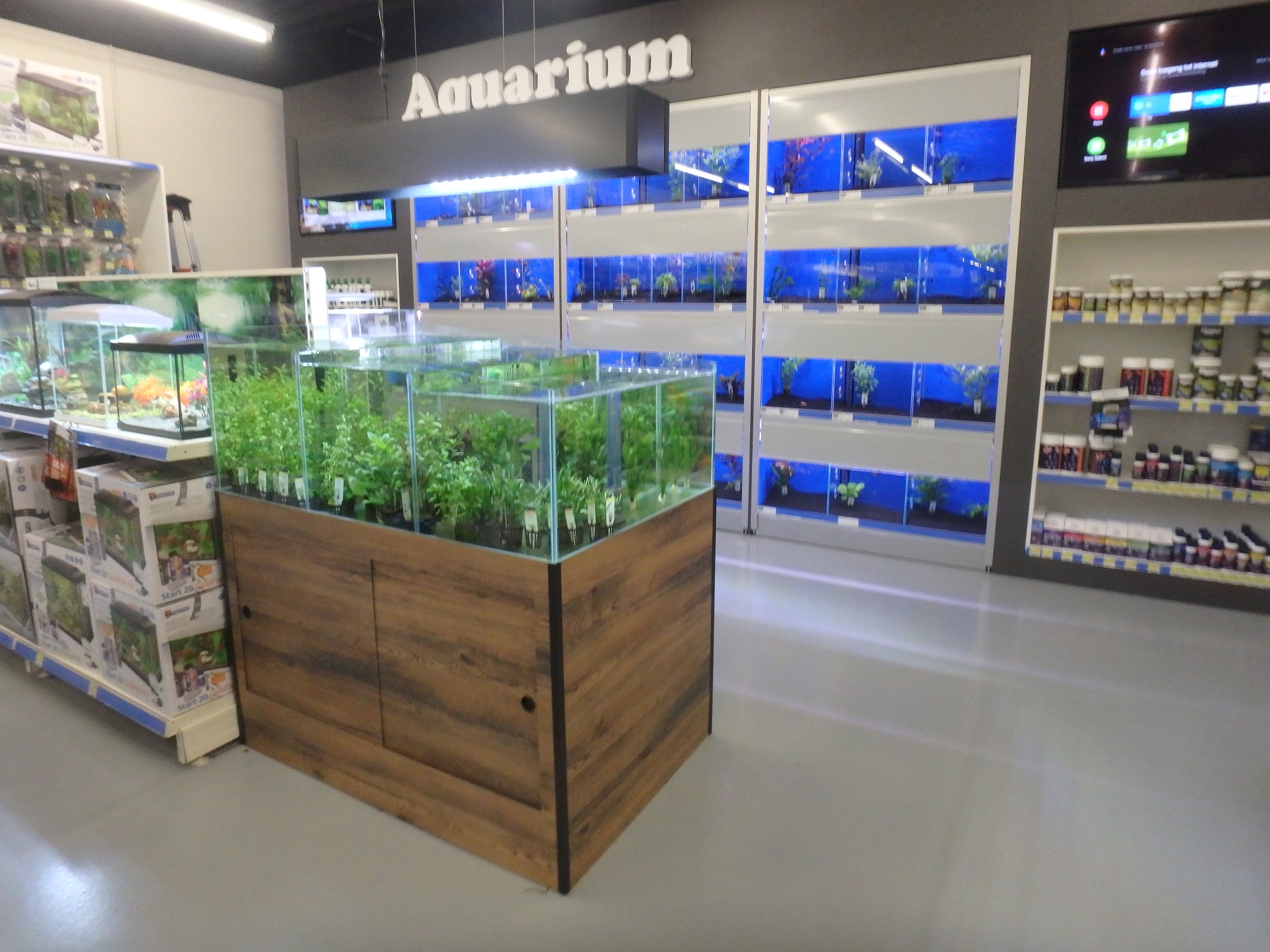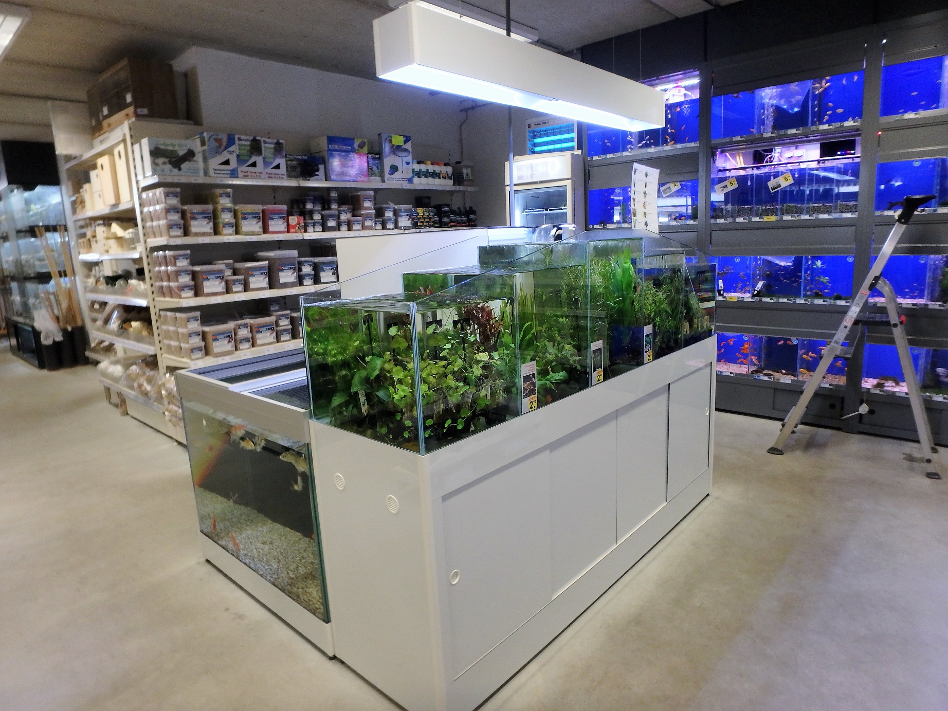 Voor alle maten planten verkoop aquariums geld dat zij worden gebouwd van 10 mm dik poly-plat geslepen glas met tussen wanden waar het water rustig over de gehele lengte heen vloeit, geplaatst afhankelijk van het formaat van het aquarium op een aluminium frame of een verzinkt stalen frame. Afhankelijk van het filter dat er in geplaats wordt, wordt het een gedeeltelijk open meubel of gesloten meubel bekleed met ACM-plaat of in kleur gecoat verzinkt stalen plaat.  4 vaks viseiland met een aquarium 100 x 100 x 40 cm verdeeld in 4 vakken van 45 x 55 x 40 cm met in ieder compartiment een eigen filter met circulatie pompje, tevens is er in het filter ruimte voor een verwarming combinatie in te plaatsen. Door de centrale opening in het midden tussen de filters kunnen de snoeren van pompjes en verwarmers naar beneden in de kast worden geleid zodat alles uit het zicht is. Geplaatst op een aluminium frame van 70 cm hoogte bekleed met ACM-plaat voorzien van schuifdeurtjes en stelpoten. Totale hoogte 110 cm excl. de stelpoten E-clip 4 vaks viseiland met een aquarium van 120 x 80 x 40 cm verdeeld in 2 vakken van 65 x 35 x 40 cm en 2 vakken van 55 x 45 x 40 cm met in ieder compartiment een eigen filter met circulatie pompje, tevens is er in het filter ruimte voor een verwarming combinatie in te plaatsen. Door de centrale opening in het midden tussen de filters kunnen de snoeren van pompjes en verwarmers naar beneden in de kast worden geleid zodat alles uit het zicht is. Geplaatst op een kunststof pallet zodat u deze gemakkelijk kunt ver plaatsen, tussen de pallet en het aquarium een aluminium frame rondom bekleed met ACM-plaat materiaal en voorzien van schuifdeurtjes. Totale hoogte 116 cm ACM-plaat leverbaar in de kleuren wit, zwart, antraciet en grijs ral 9006. Aquarium stellingen B-serie: Filter Systeem. Verlichting: Deze bestaat uit een boven ieder aquarium geplaatste SF-Retrofit Ledlamp. Automatisch water verversing systeem (AVS): Tevens is het mogelijk een automatisch water verversing systeem bij de stelling in te bouwen, aan de linker achterzijde wordt een in hoogte verstelbare afvoerbuis geplaatst en aan de rechterzijde van de stelling een aanvoerbuis met boven ieder aquarium een verdeelkraan. Het besturing systeem wordt indien mogelijk bij de stelling ingebouwd en anders in de directe omgeving van de stelling geplaatst. Garnalen en nano aquarium. Aquarium 99 x 40 x 34 cm speciaal gebouwd  voor het plaatsen op een stelling in de winkel voor de presentatie van garnaaltjes en kleine vissen. Het aquarium is verdeelt in 5 gelijke vakken voorzien van een grint filterschot en een achterwant van gecoat glas in de kleur zwart of blauw. Achter deze wand is een ruimte vrijgehouden waar het bijgeleverde opvoerpompje achter geplaatst wordt en waar tevens ruimte is om een verwarming element te plaatsen. Bij het aquarium wordt een verdeelbuis geleverd met klemmen die boven het aquarium wordt geplaatst met boven ieder compartiment een verdeel kraantje. Filter: achter het filter schot vult u het bakje op met fijn grint 1-2 mmkorrel grote. Het water wordt door het grint heen getrokken door het circulatie pompje waar door het grint als filter gaat werken. Speciaal voor winkels, die geen ruimte hebben voor een eiland, hebben wij een stelling voor kleine knaagdieren ontwikkeld. Deze bestaat uit drie boven elkaar geplaatste knaagdierhokken. 1-3 delig en 2-4 delig. Beide zij en achterkanten zijn bekleed met de gewenste kleur folie. Ook hebben wij uiteraard grotere knaagdier stellingen. Uitneembare twee-delige fronten, half glas, half traliewerk.Inclusief TL verlichting. Aan de onderzijde een open beklede schapruimte. Jarathana vogel verkoop stellingen zijn een perfecte presentatie voor u vogels. De kooien zijn in zijn geheel gebouwd van glas en voorzien van kunststof lade waardoor zij goed schoon te houden zijn en in de hokken minder kans op bloedluis is. Alle stellingen worden voorzien van T5 TL-verlichting. Stellingen zijn leverbaar met en zonder gehard glazen deuren. Deze deuren lopen op aluminium profiel met rollers op kogellagers. Tevens zijn de stellingen met glazen deuren voorzien van een mechanische afzuiging. De kooien worden aan de buitenzijde voorzien van een folie zodat deze niet met het schoonmaken of door de vogels kan worden beschadigd. Deze folie is in diverse kleuren leverbaar, eventuele foto printen zijn ook mogelijk maar hier voor dient de klant zelf een foto voor aan te dragen. Traliewerk is van glanzend verzinkt staal met klepvoerbakjes voor kanaries, tropen en kleine parkieten. Tegen meerprijs zijn er ook fronten leverbaar met grof traliewerk speciaal voor papagaaiachtige, deze zijn dan voorzien van twee transparante papagaaien voerpotten. Stellingen hebben normaal de bediening aan de voorzijde maar voor huisjes en afgesloten ruimtes kunnen ook stellingen worden gebouwd met de bediening aan de achterzijde. Tevens is het ook mogelijk om volieres in allerlei maten en soorten te maken en aan te passen voor b.v. een afgesloten verkoop ruimte. In de vogel verkoop stellingen hebben wij twee verschillende soorten: A-clip stellingen zijn stellingen die gebouwd zijn op een stalen onderstel voorzien van stelpoten met daar op geplaatst 2, 3 of 4 lagen hokken. Dit zijn solide glas op glas gestapelde hokken gebouwd van dikkere glasmaten en verbonden met kunststof profielen. De afwerking bij deze stellingen is met formica in div. kleuren of met in kleur gecoat verzinkt stalen plaatwerk. Solide glas op glas gestapelde stellingen geplaatst op een verzinkt stalen frame met stelpoten. Deze frames kunnen in hoogte variëren, dit is afhankelijk van de hoeveelheid lagen aquaria die er op het frame geplaatst moeten worden of dat er een afvoer systeem onder de aquariumstelling moet worden gemonteerd. De verlichting in deze stellingen wordt standaard uitgevoerd met een Jarathana tropical Led-balk met een kleur opbouw van daglicht-warmwit-blauw-rood. De stellingen zijn leverbaar met div. soorten filters zoals spons fi