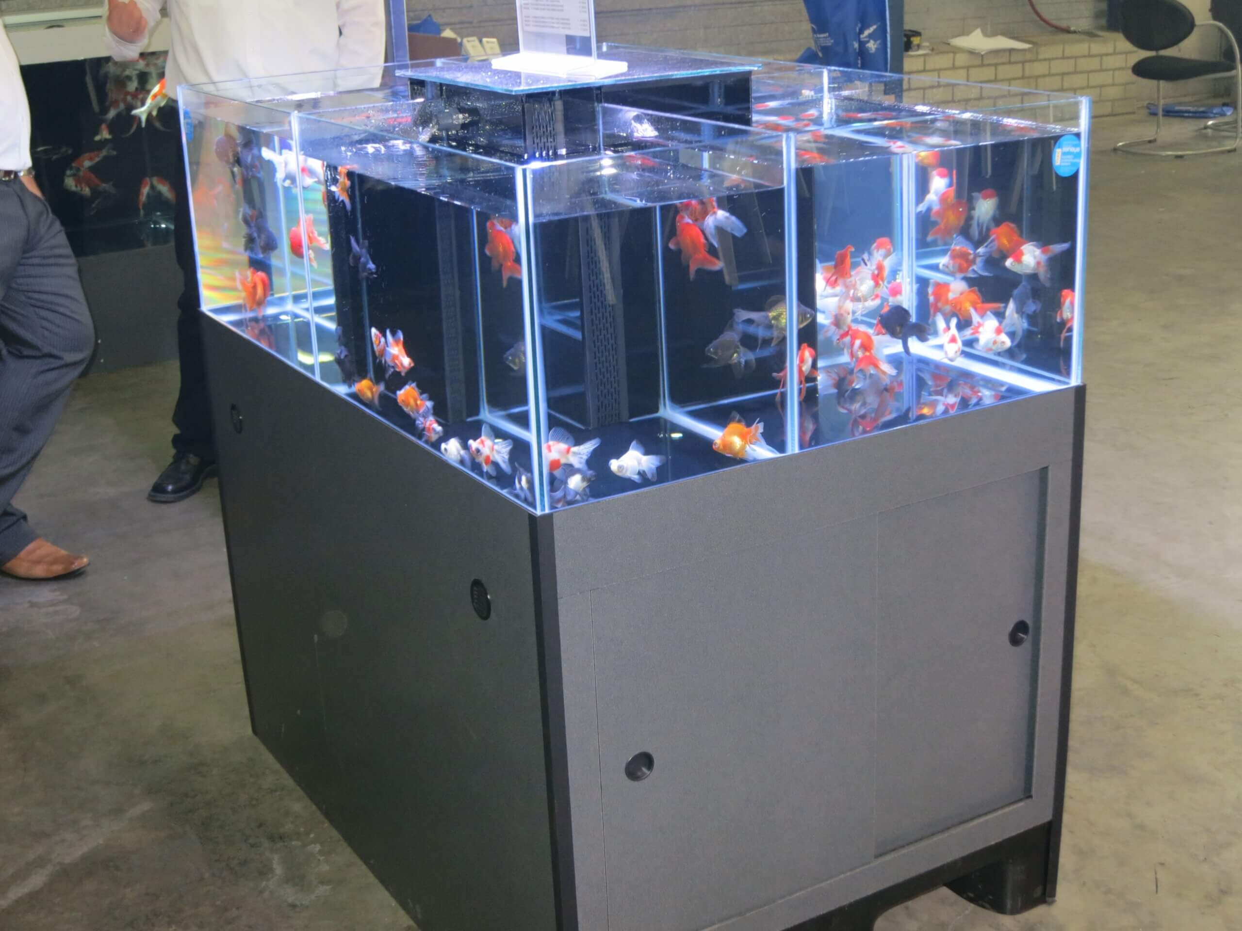 De daarop geplaatste aquaria zijn gestapeld volgens een glas op glas systeem.