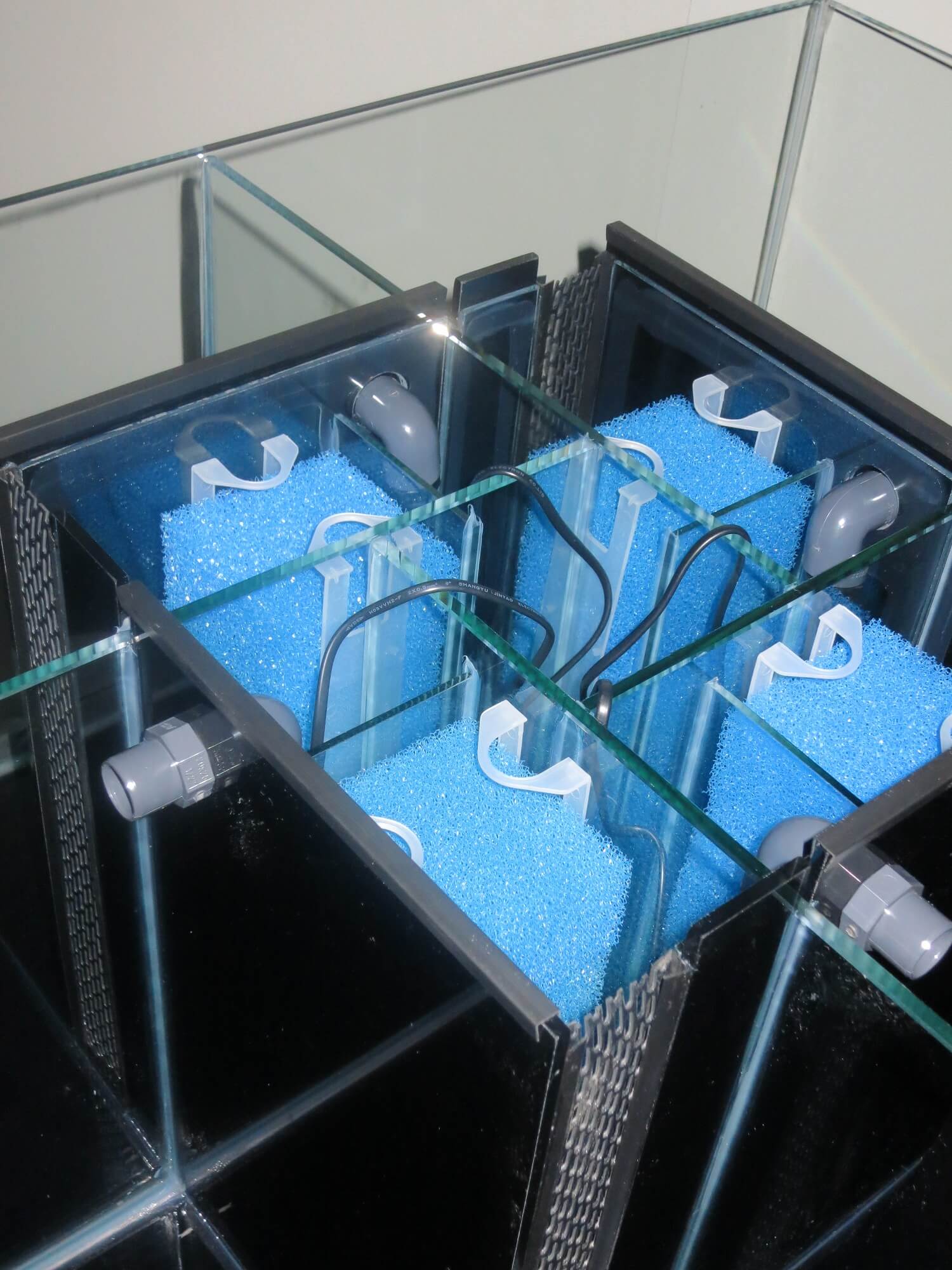 Spons filters: Deze bestaat uit een dubbele glasplaat met een blauwe of zwarte coating er tussen zodat deze niet kan beschadigen. In deze plaat is een gat geboord waar een doorvoer in is geplaatst met een aansluiting op een circulatie pompje of een luchthevel. Aan de zijkant van het filter zit een inlaat rooster waardoor het water via een daar achter geplaatste glasplaat naar boven wordt geleid waar het in een vak komt met een uitneembare cassette met sponsen. Het water trekt door de sponsen naar beneden en komt daar in het naast gelegen pompvak waar tevens genoeg ruimte is om daar een verwarming element in te plaatsen.