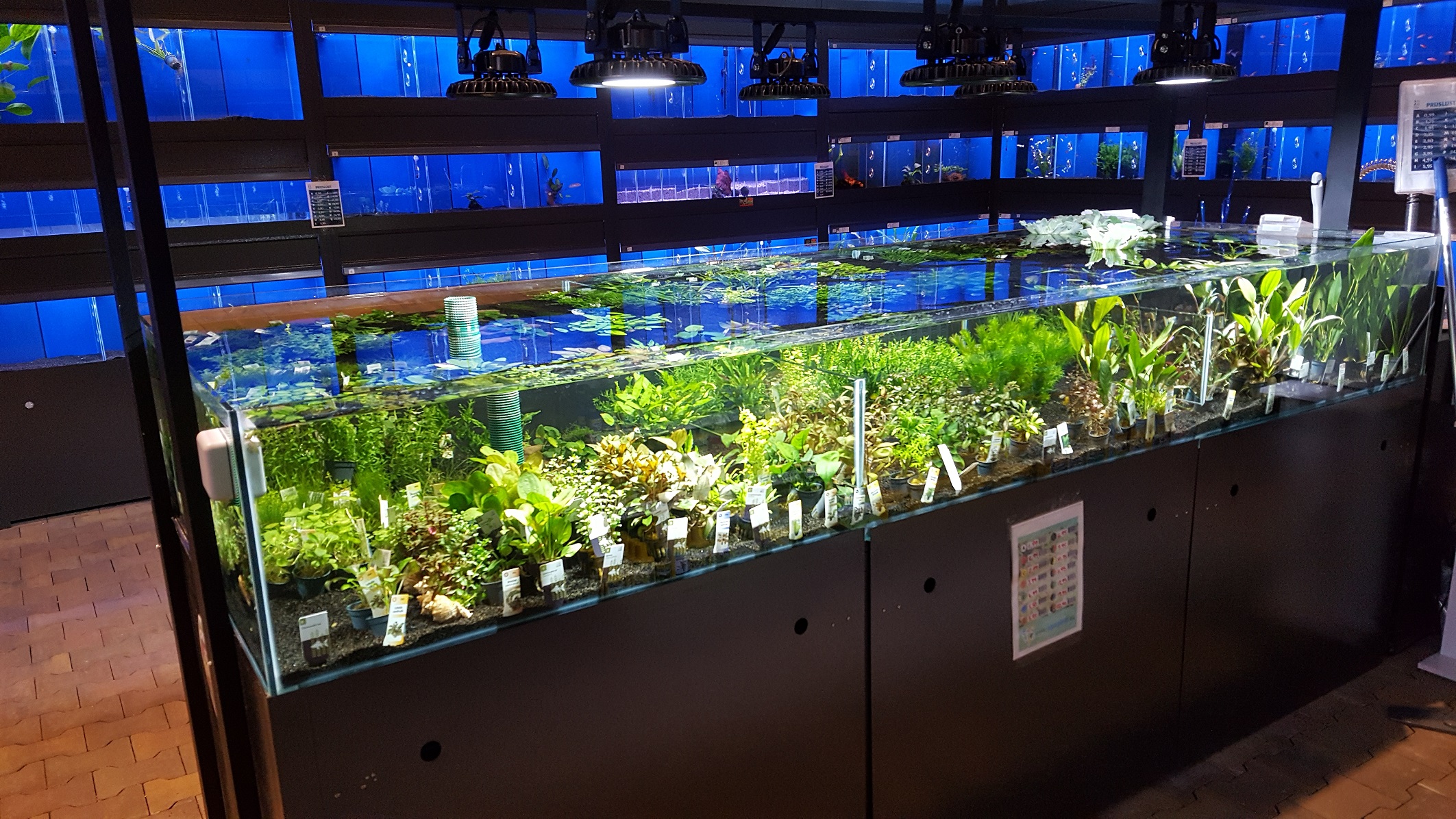 De aquarium afdeling: 25 meter aquarium stelling van de A-serie met front afwerking van RVS kleppen in zwart hamerslag gecoat en de onder deurtjes voorzien van een houtprint fineer. 12 stellingen 150 x 40 x 34 cm in 4 lagen alle aquariums in diverse afmetingen verdeeld. 4 hoek stellingen met 3 lagen aquariums 150 x 50 x 52 cm en 1 stelling van 100 xx 40 x 23 cm met 5 lagen speciaal voor kleine vissen en garnaaltjes. Alle stellingen met sponsfilters op lucht met uitzondering van de stellingen voor garnaaltjes deze heeft circulatiepompjes. Achter de stellingen is een paneel aangebracht met verdeelstukken waar elektrische bediende membraamafsluiters op zijn bevestigt met besturing computers.